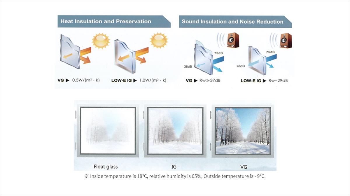 For a 6.2 mm VIG with a U-factor of 1.4 W/m2K(with the window frame), installed in a room with internal conditions of 20 °C and 60% relative humidity, no internal condensation will form at external temperatures down to –21 °C. Identical tests using a conventional 12 mm IGU with Low-E resulted in condensation forming at temperatures around 0 °C.